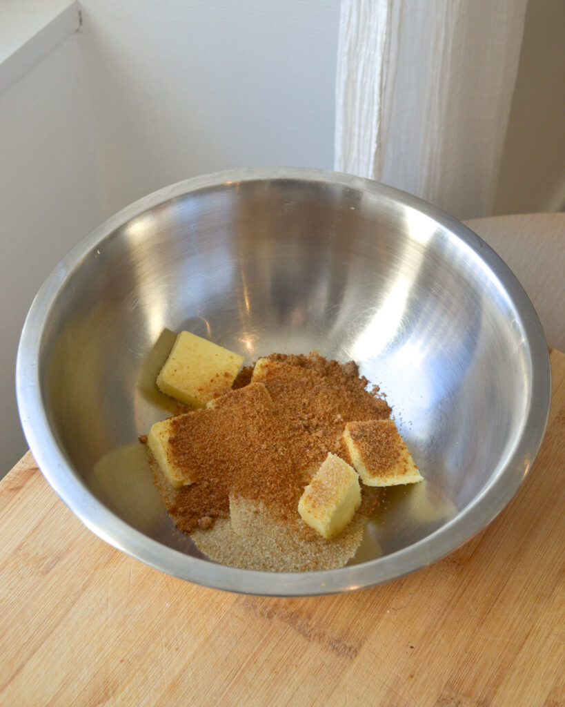 - Mettre le beurre et les sucres dans le saladier et faire fondre le beurre au bain-marie, en remuant.