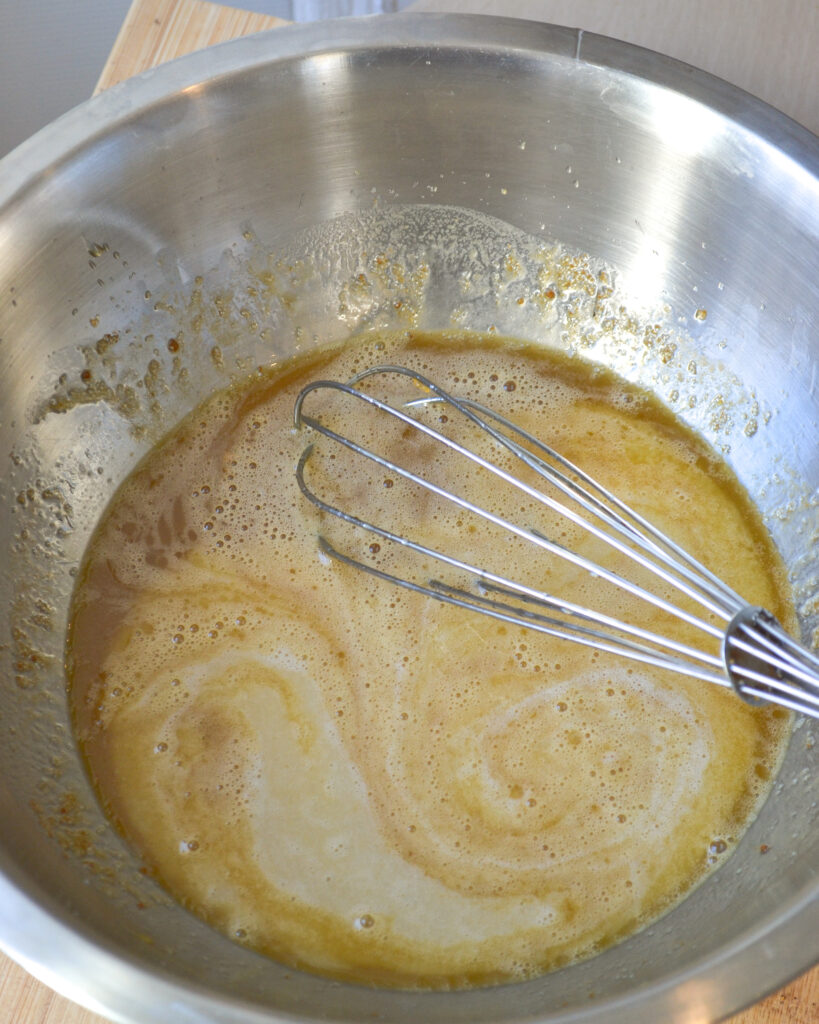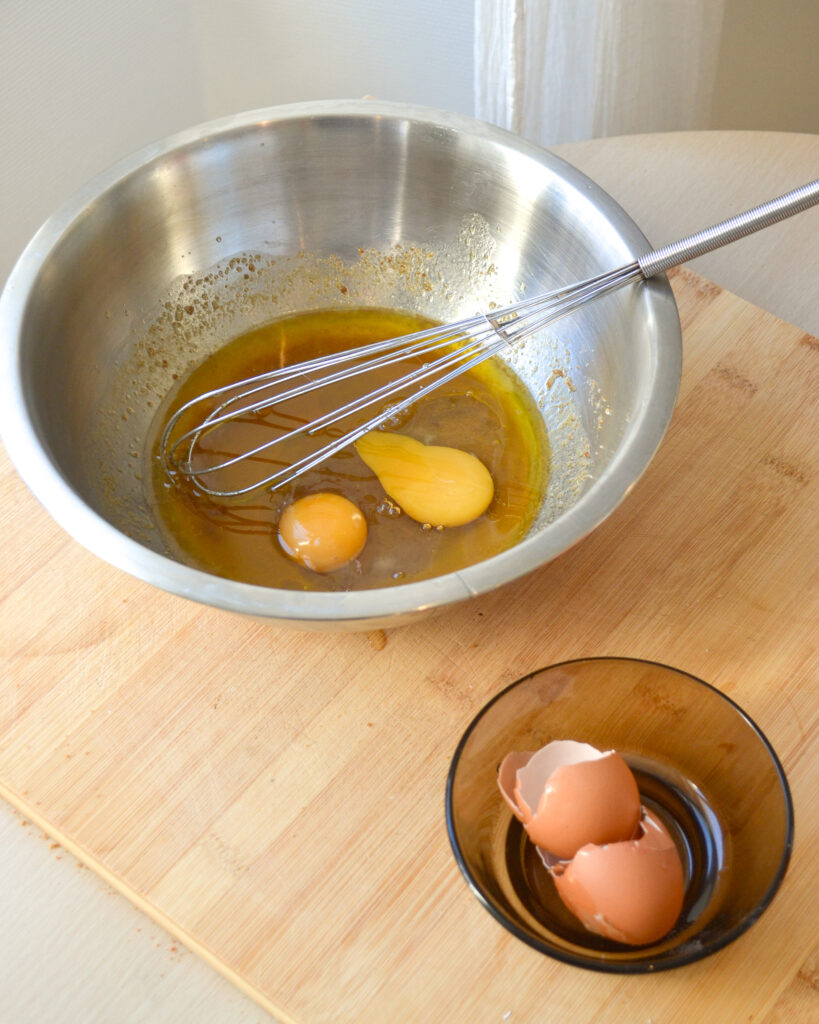 - Une fois le beurre fondu, retirer du bain-marie et ajouter les œufs, mélanger. Ajouter le lait et le miel et mélanger.