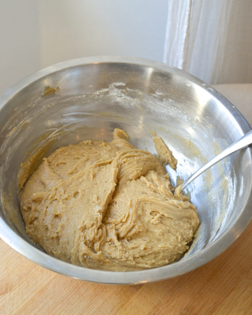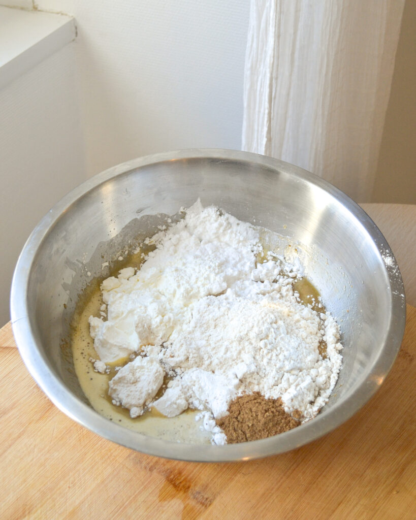 - Ajouter les farines, les épices et la levure. Mélanger avec une grande cuillère jusqu’à ce qu’il n’y ai plus de morceaux de farine visibles. Recouvrir la pâte avec du papier cuisson ou du film plastique et laisser reposer au frigo au moins une heure.