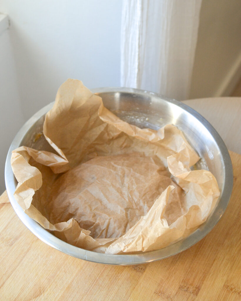 - Recouvre la pâte avec du papier cuisson (normalement il faut l’envelopper entièrement dans du film plastique, mais j’essaye de ne pas utiliser trop de plastique) et mets-la au frigo au moins 1 heure.
