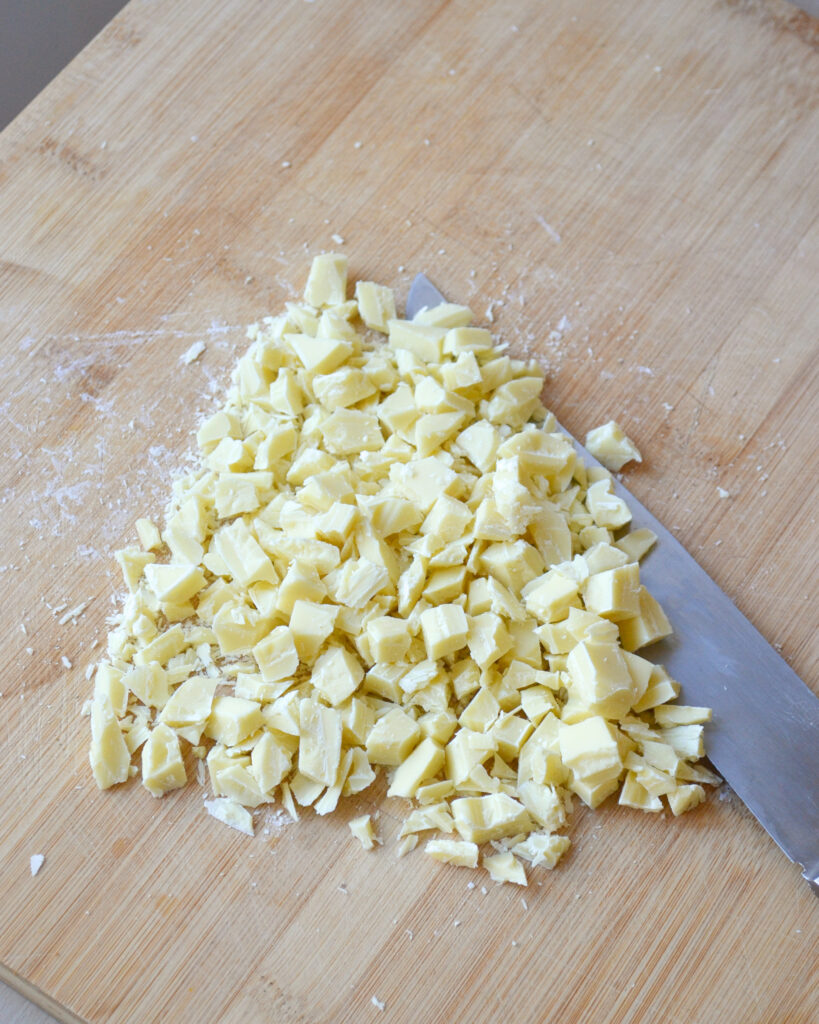 - Hache grossièrement le chocolat blanc et mélange-le à la pâte.