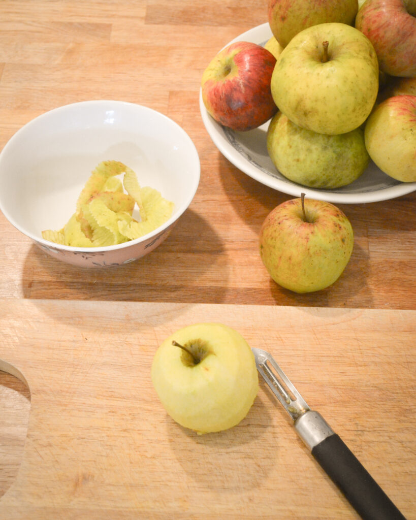 - Sur la planche à découper, épluche les pommes avec l’économe. Dépose les épluchures dans le bol à déchets.