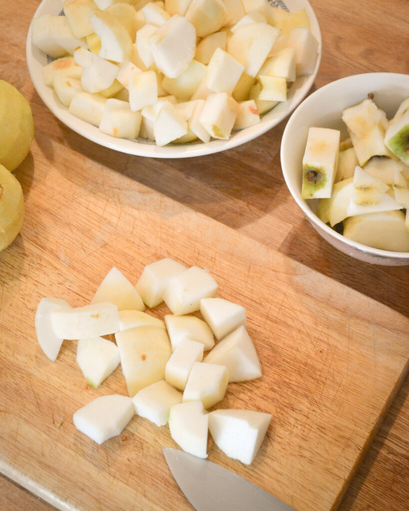 - Découpe ensuite les pommes en morceaux et mets-les dans un petit saladier. Ce n’est pas grave s’ils ne font pas tous la même taille.
