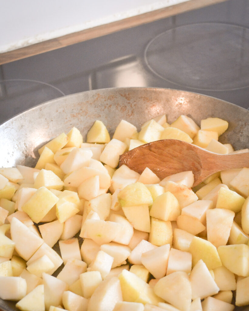 - Dans une poêle, faire fondre 25g de beurre avec 1 cuillère à soupe de sucre. Ajouter les pommes et les laisser cuire à feu doux, remuer régulièrement.