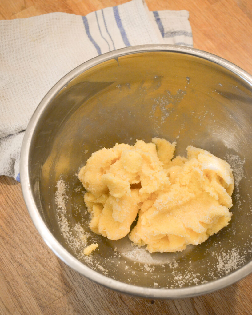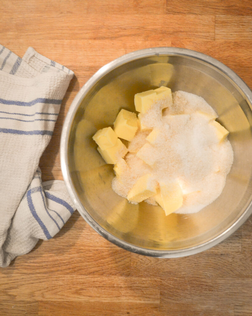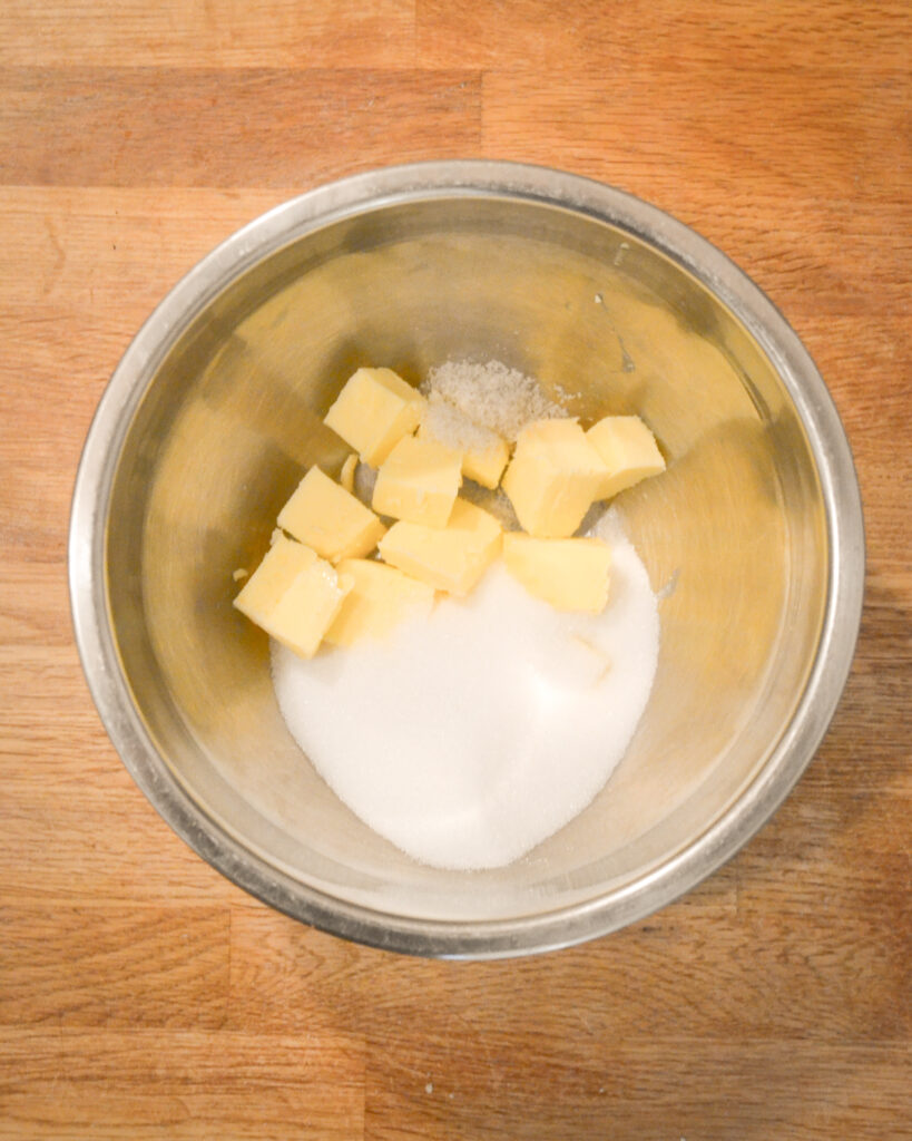 - Dans un saladier, couper 200g de beurre en dés et ajouter 200g de sucre. Mélanger avec les mains pour obtenir une pâte.