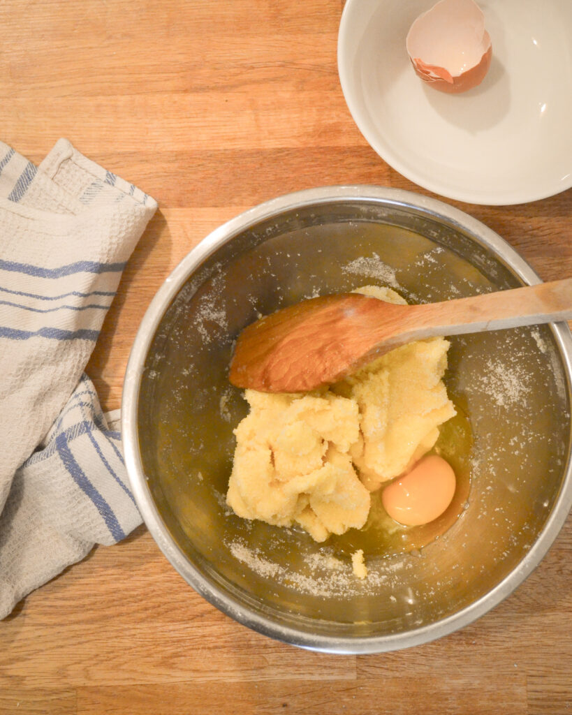 - Quand l’œuf est à peu près incorporé, ajoute un deuxième œuf, mets la coquille dans le bol. Mélange avec la cuillère à soupe jusqu’à ce qu’il soit à peu près bien incorporé.