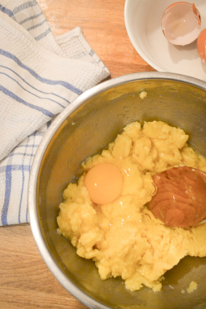 - Ajouter les œufs un par un en mélangeant avec une spatule entre chaque.