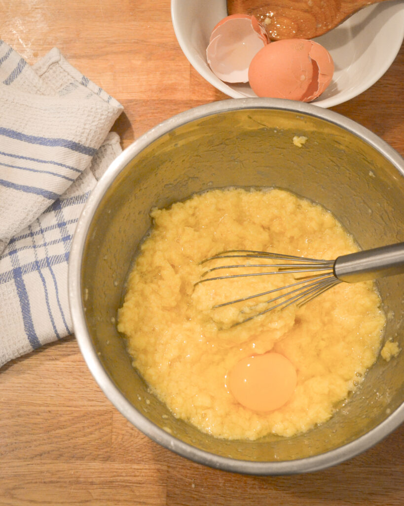 - Ajoute le dernier œuf, mets la coquille dans le bol, mélange bien avec le fouet jusqu’à avoir une pâte homogène.