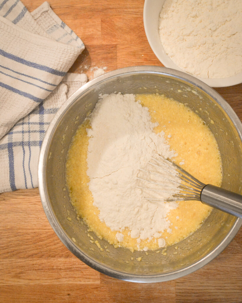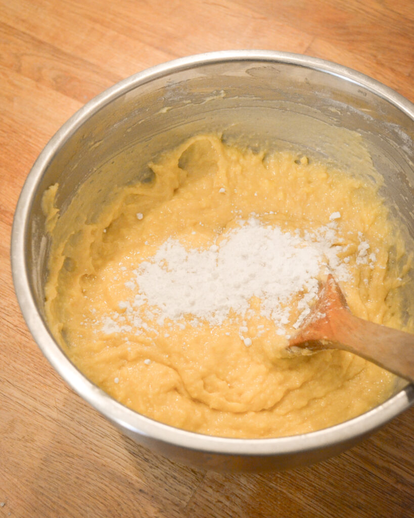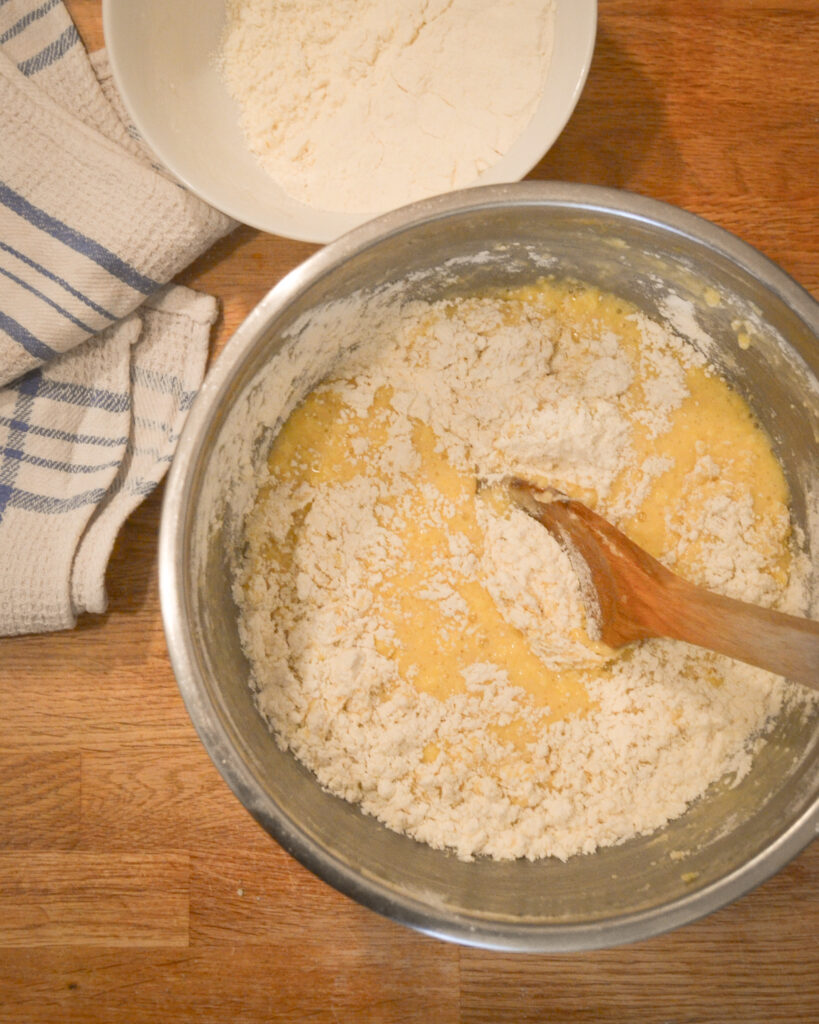 - Ajoute le reste de farine et 1 cuillère à café de levure chimique, et mélange bien avec la cuillère jusqu’à ce qu’il n’y ait plus de morceaux de farine visibles.