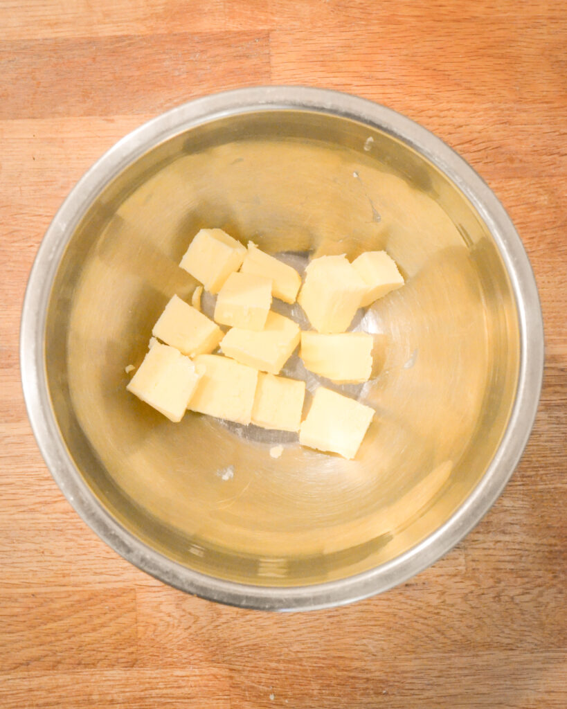 - Pèse 50 grammes de beurre et coupe-les en dés dans un petit saladier.