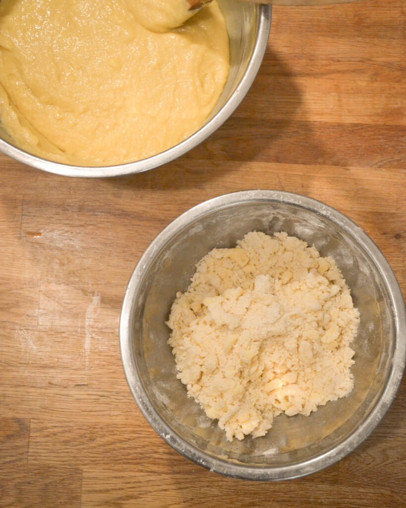 - Réaliser le crumble dans un autre saladier, en mélangeant à la main 50g de beurre coupé en dés, 40g de sucre, 90g de farine et 1/2 cuillère à café de sel, jusqu’à obtenir une pâte à la texture sableuse.