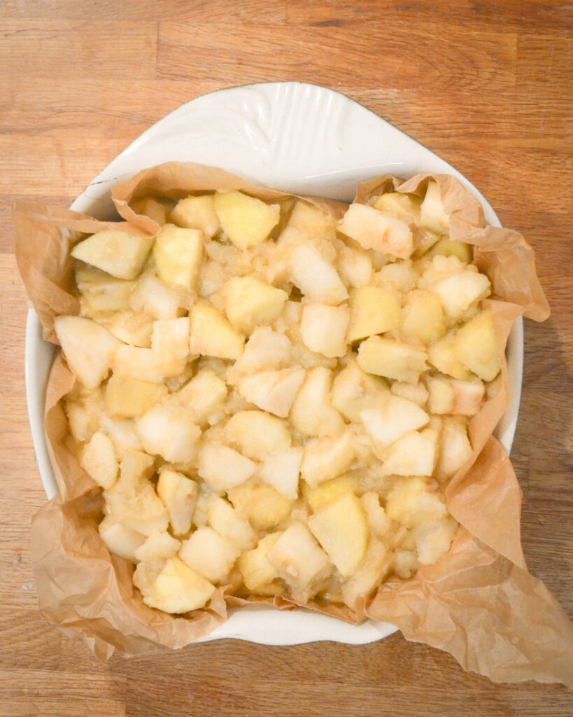 - Découper une feuille de papier cuisson, la froisser en boule et la déplier dans le plat. Verser la pâte, puis les pommes par-dessus, en les répartissant en une couche uniforme. Ajouter le crumble et bien le répartir sur les pommes.