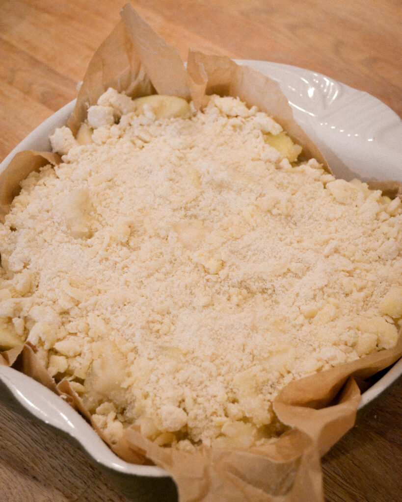 - Ajoute le crumble sur les pommes, en faisant attention à ce que la couche soit à peu près uniforme.