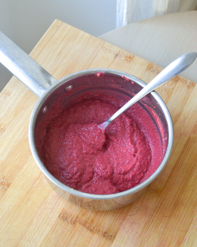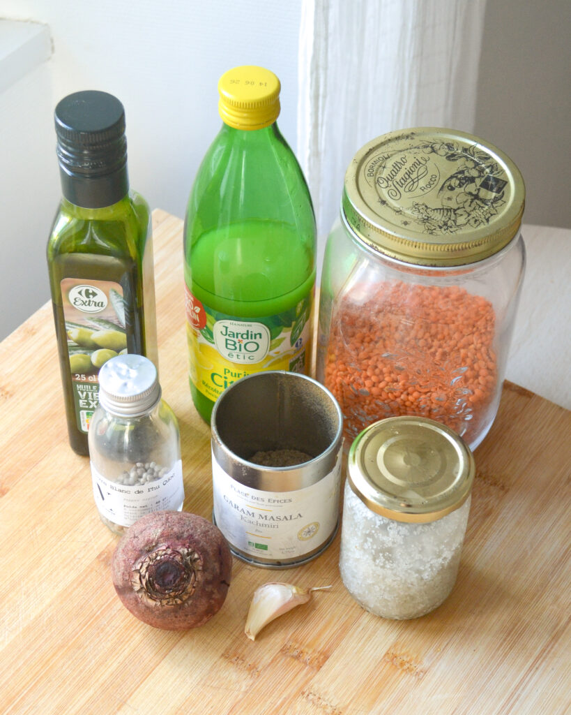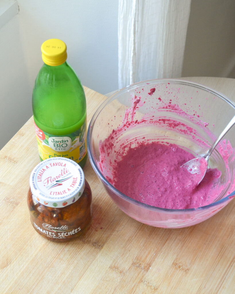 La betterave : j’utilise ici de la betterave cuite dans de l’eau bouillante pendant une heure environ, mais tu peux évidemment utiliser une betterave vendue déjà cuite en grande surface.