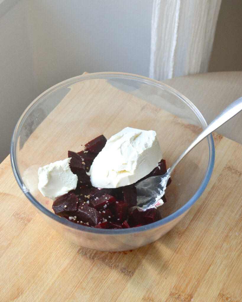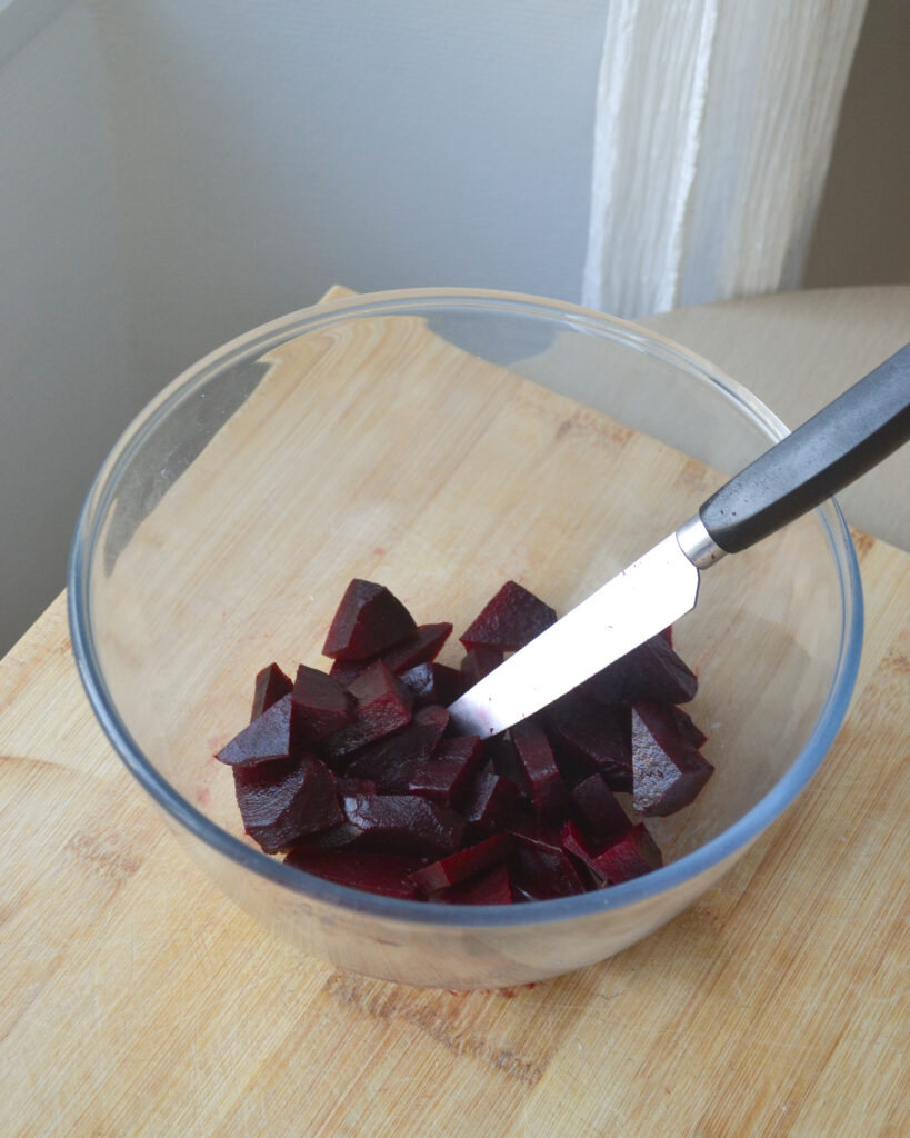 - Coupe la betterave en morceaux et mets-la dans le saladier.