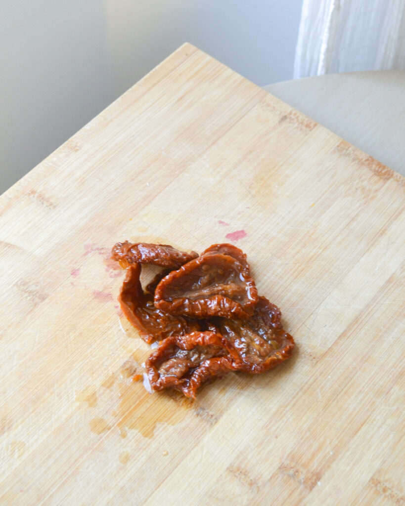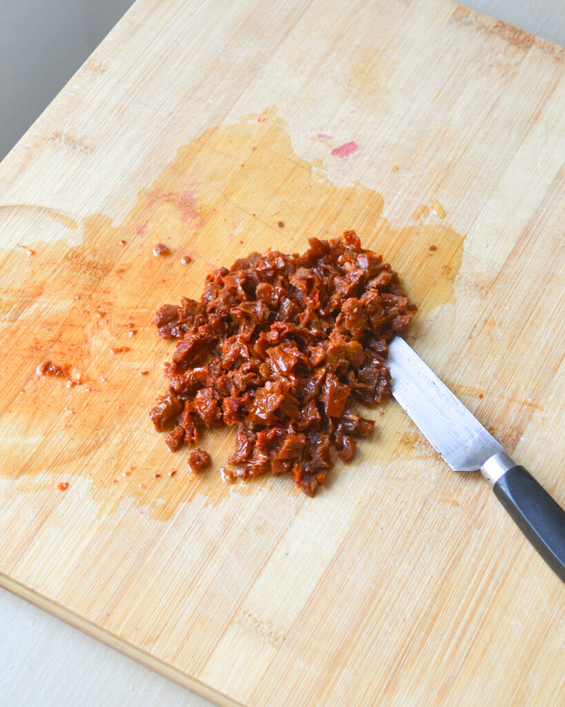 - Hache grossièrement 5 ou 6 tomates séchées.