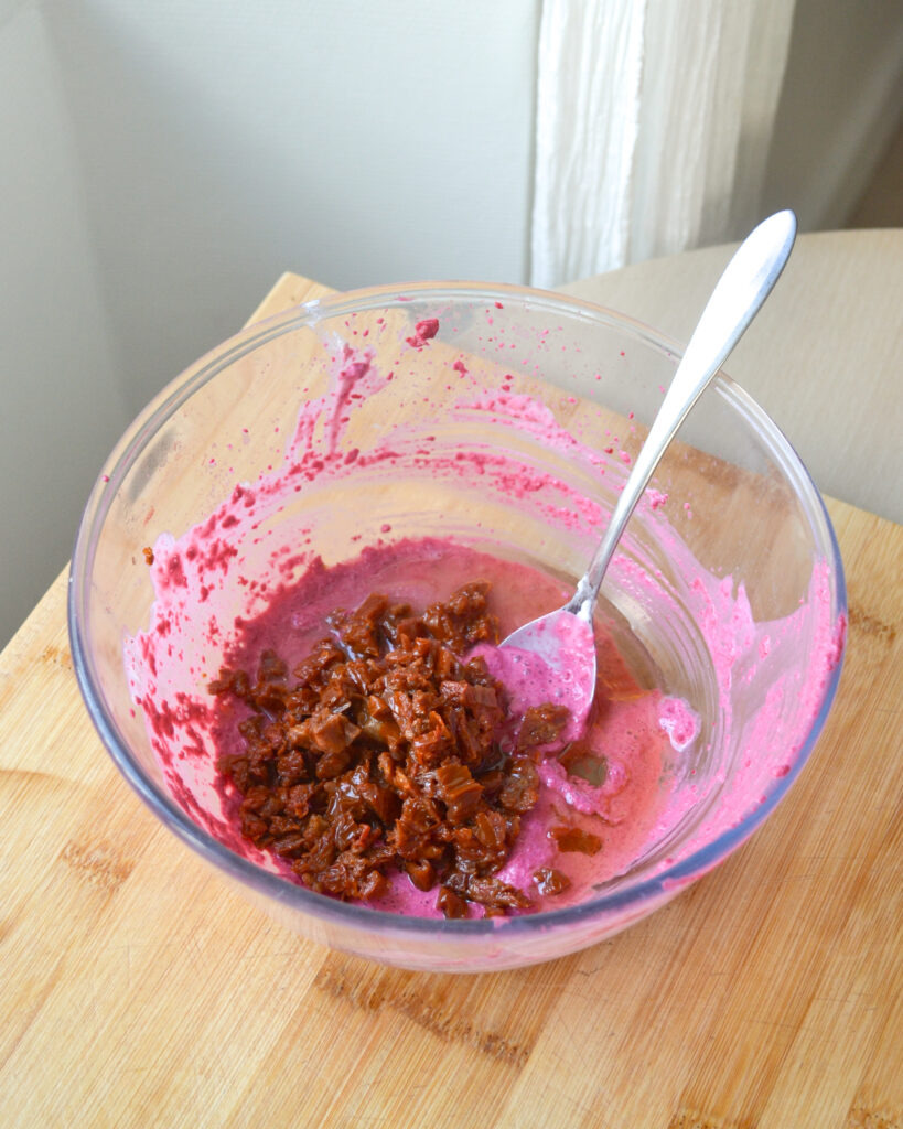 - Mixe grossièrement le tout : le but n’est pas d’avoir une texture homogène, mais d’avoir toujours des petits morceaux de tomate séchée ici et là.