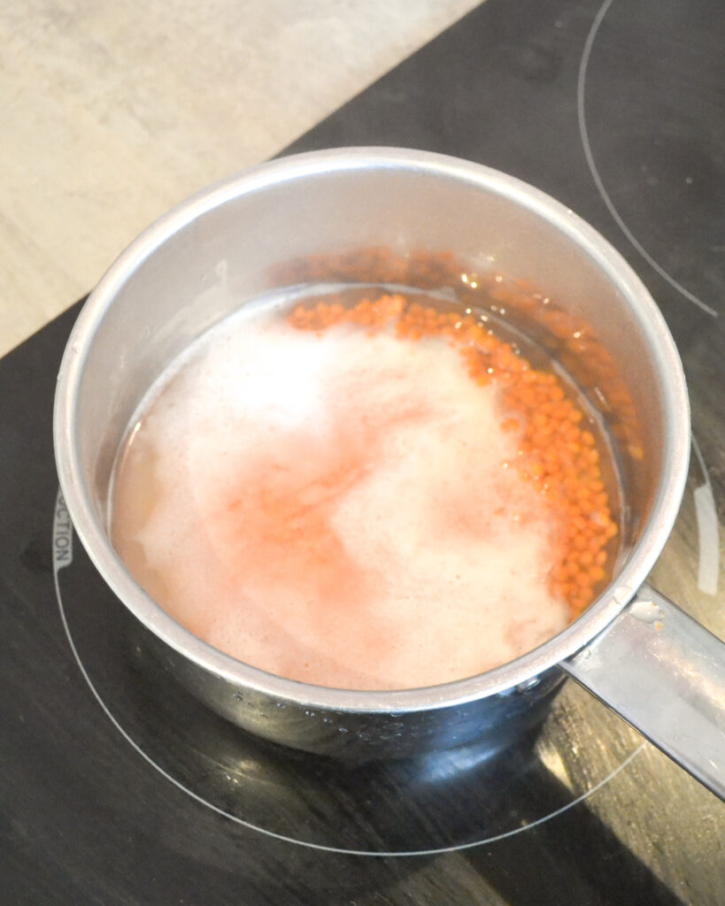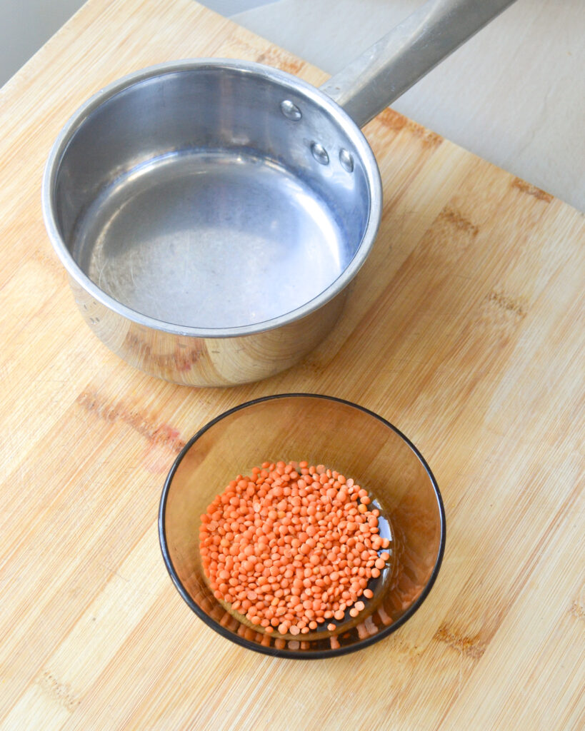 - Dose environ 1/4 du ramequin de lentilles corail et mets-les dans la casserole.