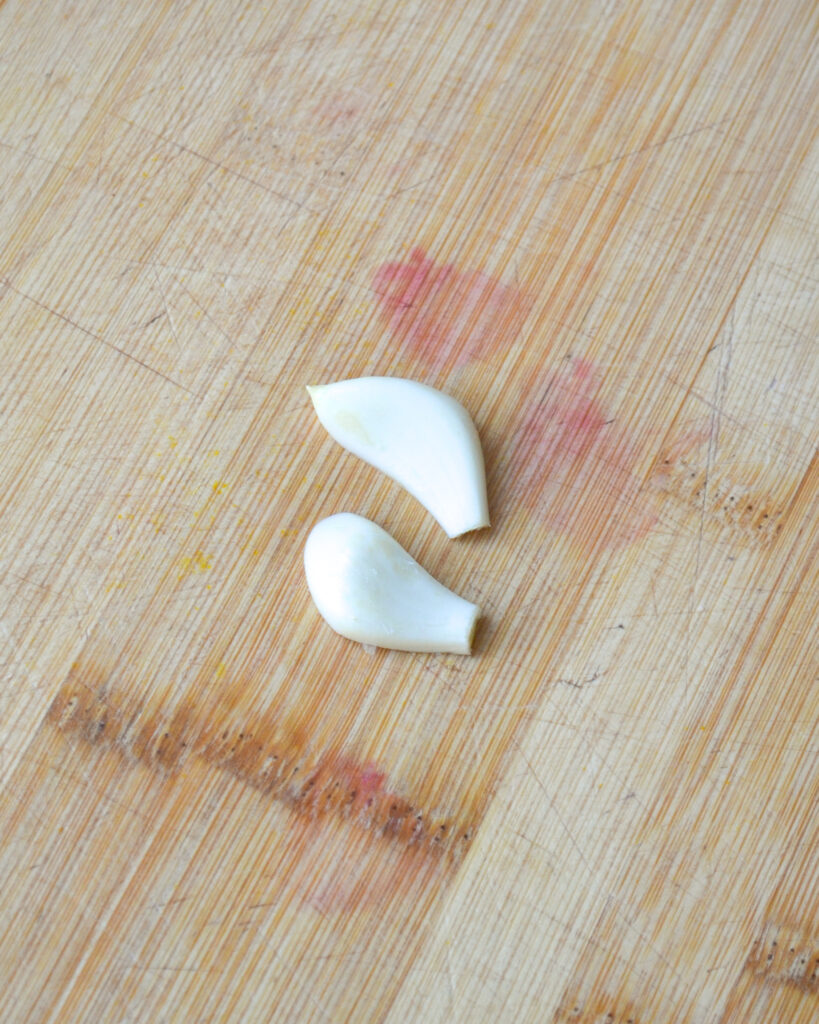 - Pendant que les lentilles cuisent, coupe la gousse d’ail et deux et ne garde qu’une moitié (astuce : mets l’autre moitié au congélateur pour de prochaines recettes).
