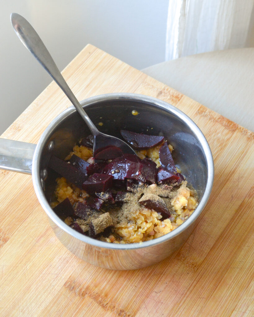 - Une fois que les lentilles sont cuites, ajoute la betterave et l’ail dans la casserole, avec une pincée de sel et de poivre (environ 1/4 de cuillère à café).