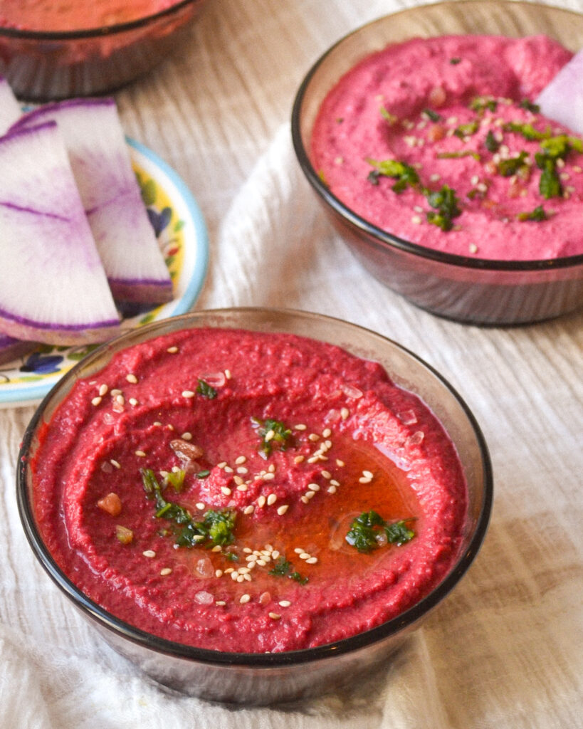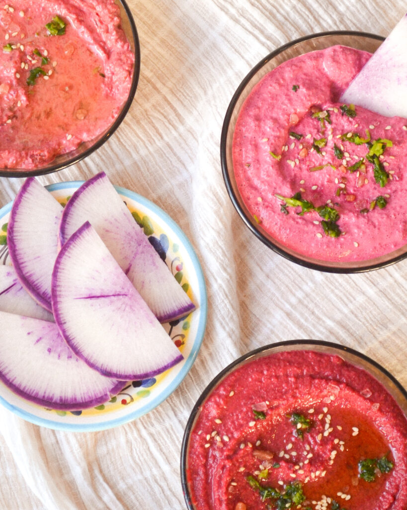 J’ai servi les trois préparations ensemble, chacune dans un ramequin. Avec un radis mauve hyper frais et croquant, ou du pain de boulangerie, cela donne un apéro gourmand et joliment coloré !
